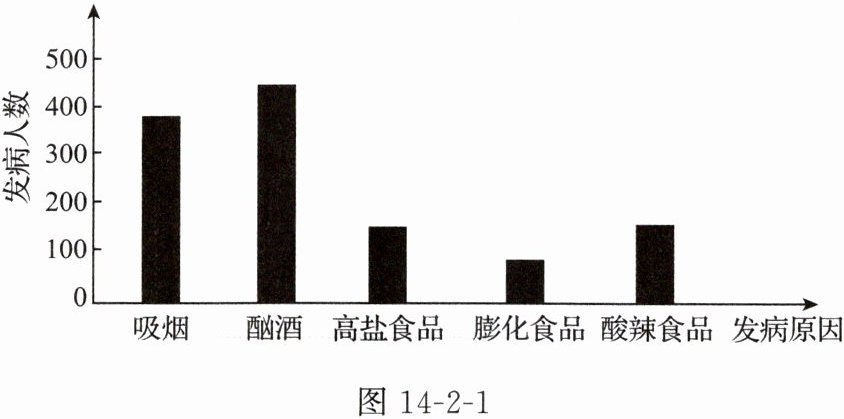 7. (态度责任)图 14-2-1 是研究人员对 1 200 名食管癌患者发病原因调查所得到的数据。从调查结果可知,导致食管癌发生的主要原因是(