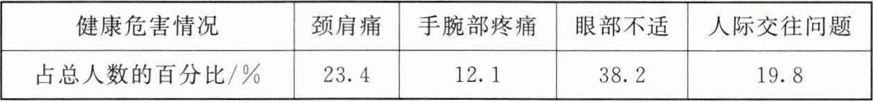 (答出一条即可)。(4)随着网络信息化的发展,“低头族”的数量越来越多。“低头族”带来的最大影响就是导致了人们交流的缺失。某中学社团在校园随机发放调查问卷,对学生使用电子产品及健康危害情况进行统计,结果如下表所示:
