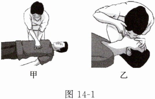 (2)图 14-1 中甲是胸外心脏按压操作,乙是人工呼吸操作。在进行心肺复苏的过程中,应先进行