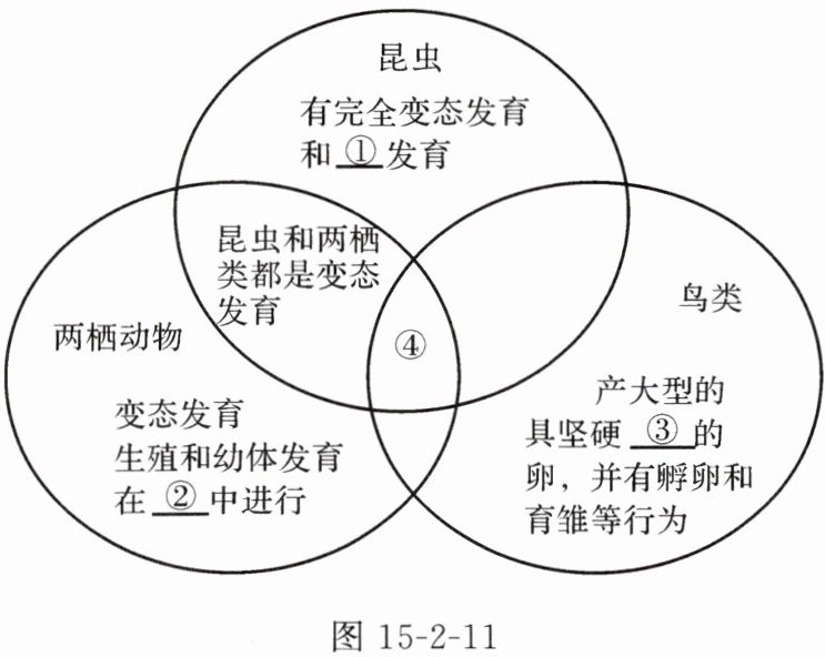 6. (科学思维)图15-2-11比较归纳了昆虫、两栖动物、鸟类生殖和发育的相同点和不同点,请据图回答问题。