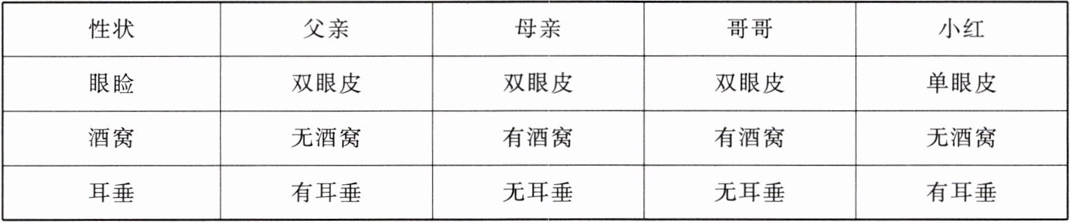 7. 下表是小红同学对自己家庭成员的个别性状调查的统计情况,请据表回答有关问题。