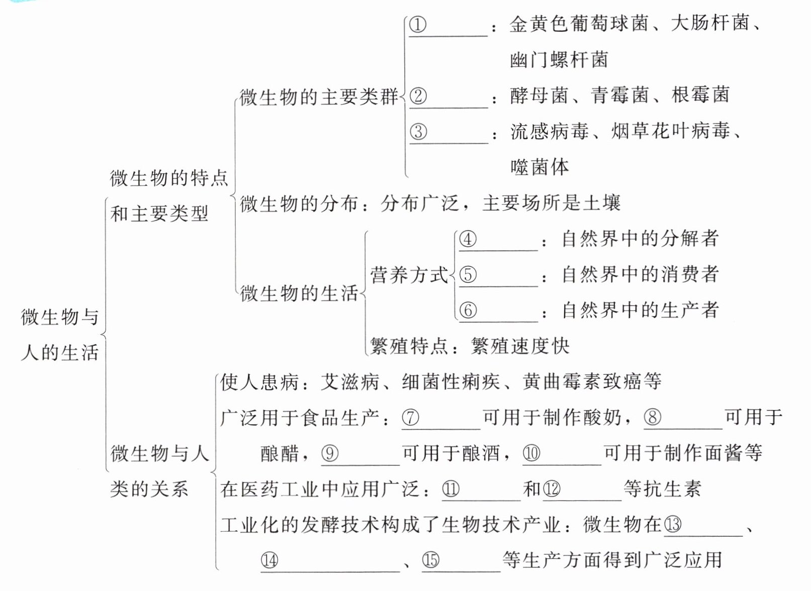 ①细菌 ②真菌 ③病毒 ④腐生 ⑤寄生 ⑥自养 ⑦乳酸菌 ⑧醋酸菌 ⑨酵母菌 ⑩米曲霉 ⑪青霉素 ⑫链霉素 ⑬氨基酸 ⑭食用有机酸 ⑮酶制剂