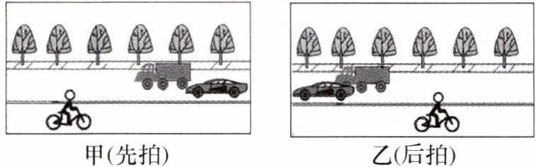 13. 小明在马路边上拍街景照片,连续拍了两张,如图甲、乙所示,如果卡车是向西运动的,以行驶的卡车为参照物,树是