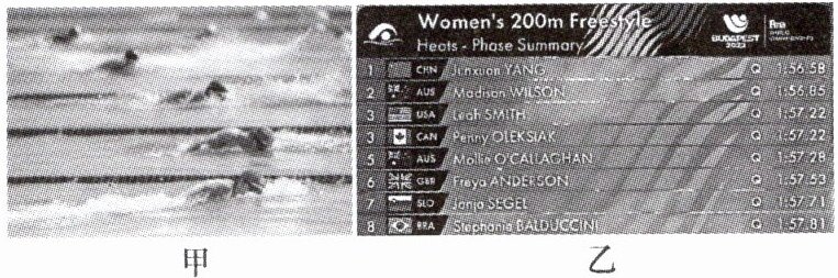 1. 如图所示,图甲为观众看到的游泳比赛现况,观众能判断此时谁游得更快是通过