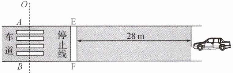 15. (2024·石家庄长安区期末)如图所示,当该车道斑马线上有行人时,机动车车头就不得越过停止线,否则视为违反交规,现小明以1m/s的速度沿垂直于车道的虚线OAB匀速穿过该车道,其中A、B分别为车道两侧边线上的两个位置,当图中轿车以15m/s的速度匀速向左行驶且车头距停止线28m时,司机发现小明正位于O处,于是立即刹车使轿车减速,经过5s汽车停了下来,该过程中汽车的平均速度为5.8m/s,已知O、A相距2m,A、B相距4m。