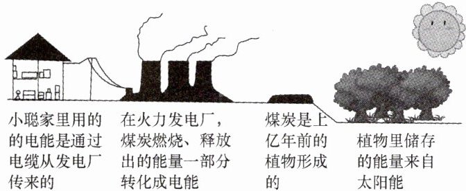 6. 小聪和同学们看下面的漫画,一同追踪家里用的电能的来源时纷纷发表了各自的观点,其中说法不正确的是(