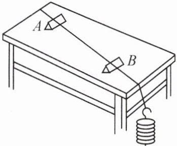 为了研究猜想①是否正确,小杰进行了如下实验:如图所示,将一根二胡琴弦的一端绕结在桌子腿上,另一端绕过桌边的小滑轮(滑轮未画出),挂上几个砝码,使它在桌面上拉紧,并用 A、B 两个三棱柱状的小木块将弦支起。用一把塑料尺弹拨弦的中部,就可以听见弦发出的声音。然后在其他条件不变的情况下,改变 A、B 间的距离进行多次实验,发现 A、B 间的距离越长,音调越低。