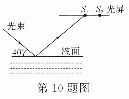 10. (2024·石家庄桥西区期末)如图所示,一束入射光与液面的夹角保持 40°不变,经液面反射后在光屏上形成亮点 S₁,此时反射角为