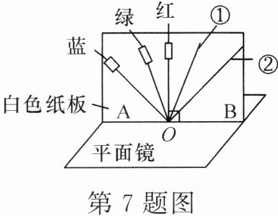 7. 如图所示,小海同学在“探究光的反射定律”实验中,利用红、绿、蓝三种色光的激光笔进行实验,他将位于同一平面内的白色纸板立在平面镜上。下列说法中正确的是(