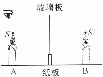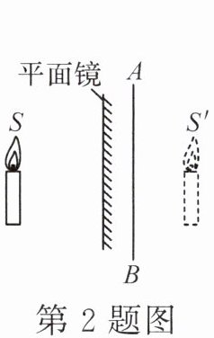 2. 如图,物体$S$在平面镜中所成的像为$S'$。若在镜后放置一块透明玻璃$AB$,则像$S'$将 (