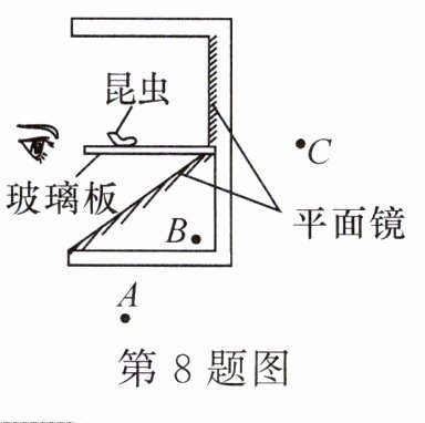 8. 如图是用两块平面镜制作的能同时观察昆虫背部和腹部的观察箱。能看到昆虫在平面镜中的像,是因为光经平面镜
