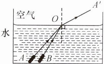 5. (2024·河南)如图,观光水池中,一束红光沿AO方向从水中射入空气,折射光线为OA'。若另一束红光沿BO方向从水中射入空气,请大致画出入射光线BO的折射光线,并标出对应的折射角r。