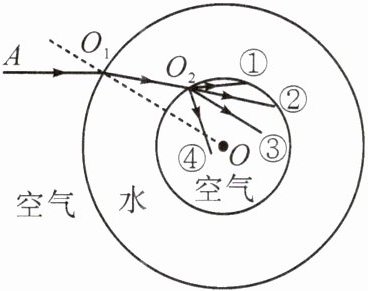 14. 在天宫课堂中,航天员王亚平将空气注入水球,形成的气泡球与水球的球心都在O点。一束光从空气射入水球的光路如图所示,其中球心O与入射点O₁的连线为法线。则进入气泡球的折射光线可能为(