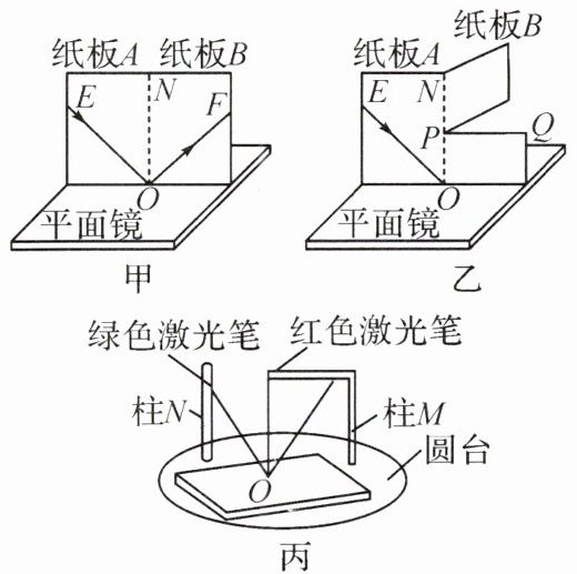 (5)接下来老师进行了如下演示(图丙):先用加湿器使整个教室充满雾气,将平面镜放在一能转动的水平圆台上,在柱$M$上固定一红色激光笔,使其发出的光垂直射向平面镜上的$O$点,其作用是为了显示法线的位置。然后打开固定在柱$N$上的绿色激光笔,使绿色激光射向$O$点,出现了如图丙所示的情景。老师水平方向缓缓转动圆台,当观察到
