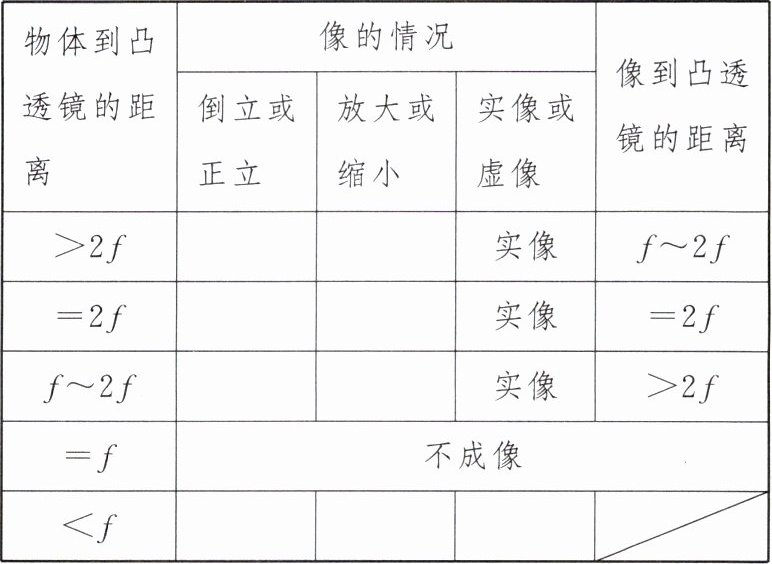 (表格从左到右,从上到下依次填)倒立;缩小;倒立;等大;倒立;放大;正立;放大;虚像