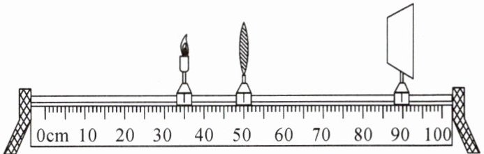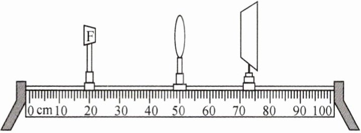 9. 如图所示,小红同学在探究凸透镜成像规律的实验中,将焦距 f = 15 cm 的凸透镜固定在光具座上 50 cm 刻度线处,发光体固定在光具座上 20 cm 刻度线处,之后应将光屏向