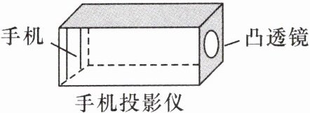 10. (2024·聊城)在学习了凸透镜成像规律后,小慧同学计划制作一个“手机投影仪”。现有器材如下:焦距分别为10cm、20cm、30cm的凸透镜各一个,手机一部,长为30cm的纸盒,胶带和剪刀等。“投影仪”模型如图所示,将手机和凸透镜分别固定在纸盒的两端,调整“投影仪”到墙面的距离,可在墙上看到手机画面清晰放大的像。下列说法正确的是(