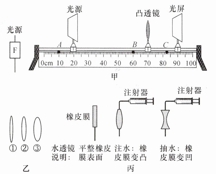 (填“A”“B”或“C”)点,缓缓调节水透镜中的水量,当水透镜形成焦距合适的凹