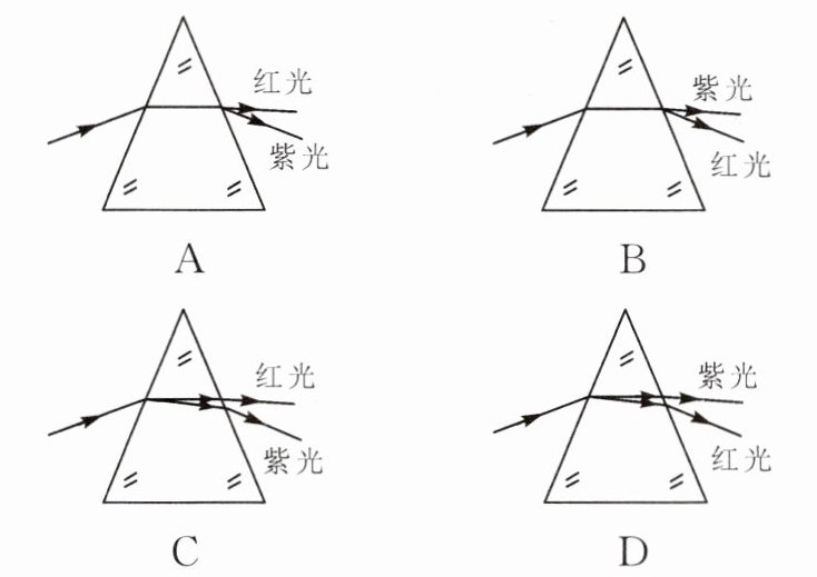 5. 光的色散说明白光是一种复色光,棱镜对不同色光的偏折程度不同,其中对红光的偏折程度最小,对紫光的偏折程度最大。图中能正确表示白光通过三棱镜发生色散的是(