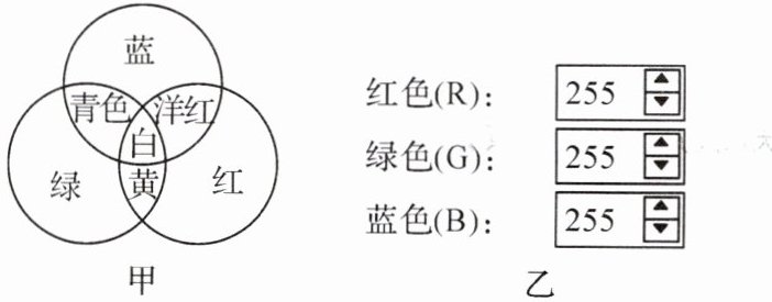 8. 图甲为光的三原色示意图,在办公软件中打开“颜色”对话框的“自定义”选项卡,可以在屏幕中看到白色是由红、绿、蓝三种色光混合而成的(图乙),其亮度等级均为255(255是最高亮度等级)。把蓝色光亮度等级调为0,由红色光和绿色光混合而成的矩形框显示