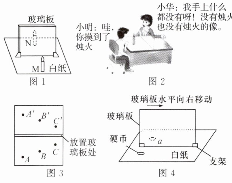 (填“3 mm”或“6 mm”)的玻璃板。(2)如图 1 所示,在竖直放置的玻璃板前放一支点燃的蜡烛 M,可以看到玻璃板后面出现蜡烛的像,小明拿出另一支相同的