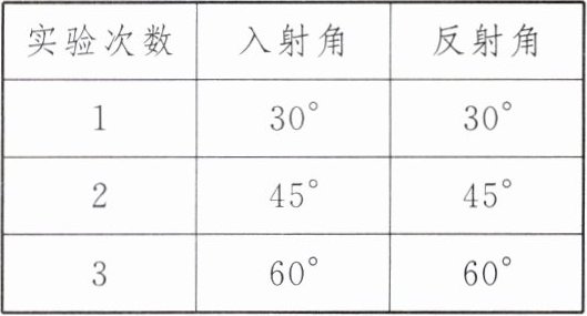 (3)使光束以不同角度入射进行实验,测量数据如上表所示。由此可得:在反射现象中,