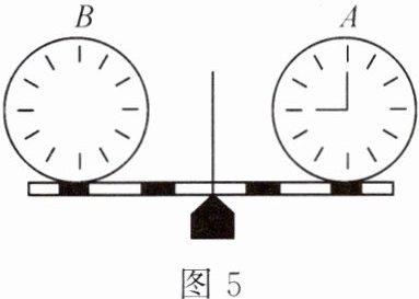 (6)小伟看到自己的手表与同桌的相同,于是小伟突发奇想:用两块相同的手表替代 A、B 蜡烛,正立于玻璃板两侧,如图 5 所示。此时 A 手表指针指在 9 点整,那么 B 手表的指针应调至