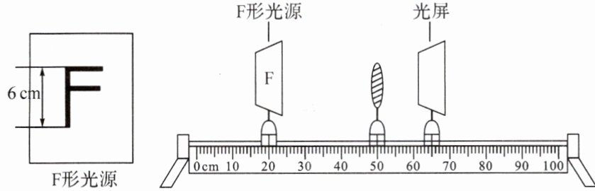 4. (2024·贵州)如图所示,用焦距为 10 cm 的凸透镜、高度为 6 cm 的 F 形光源、光屏和光具座等器材探究凸透镜成像大小的变化规律,通过测量像的高度反映像的大小。
