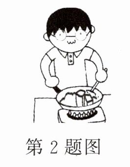 2. 如图所示,小明盛热汤时,戴的眼镜马上变得雾蒙蒙的,什么都看不清了,这是因为水先____成水蒸气,遇冷又____成小水珠附着在眼镜片上。(填物态变化名称)