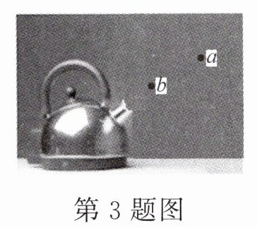 3. 如图所示,用水壶烧水,水烧开后能看到壶嘴周围有“白气”产生。“白气”是由于____(填“壶内”或“壶外”)的水蒸气遇冷____(填物态变化名称)形成的,其中____(填“a”或“b”)处的“白气”较浓。