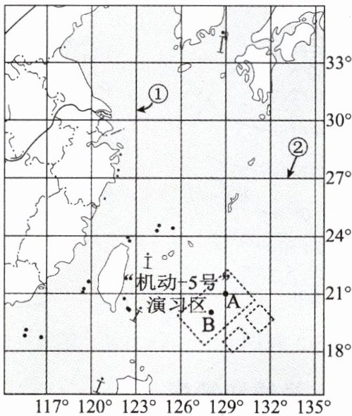 16. 中国海军三大舰队在西太平洋海域举行代号为“机动 - 5 号”的远海实兵对抗演习。如图示意“机动 - 5 号”演习区。读图,回答下列问题。