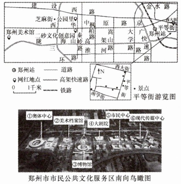 近年来,郑州市将一些旧城街道、废弃工业厂区进行了改造,使其成为热门的“网红地点”。假期期间,你的朋友小明专程乘坐火车到郑州市网红地点打卡。下图为郑州市网红地点示意图及平等街游览图和郑州市市民公共文化服务区南向鸟瞰图。