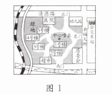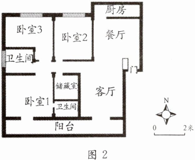 (北京中考)小鹤随父母前往某小区看房。图 1 为北京某小区平面示意图,图 2 为图 1 中 1 号楼某户型图。读图,完成 5~7 题。