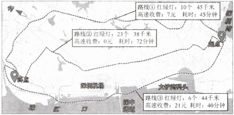 家住南山区(起点)的小洲一家驾车前往宝安区的海上田园(终点)游玩,在电子地图上查询到三条路线方案,下图示意三条路线方案及其相关信息。据此完成 8~10 题。