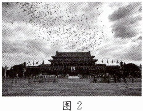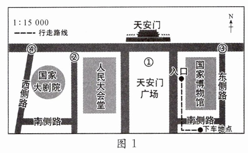 国庆期间,福州中学生小闽一家使用电子地图导航自驾去北京天安门广场观看升旗仪式。图 1 为天安门地区平面图,图 2 为小闽拍摄的照片。据此完成 11~12 题。
