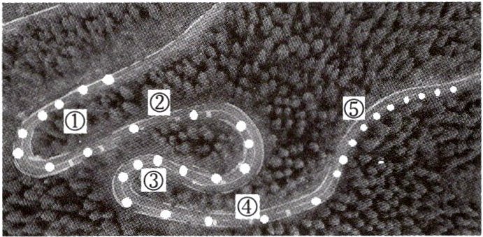 四川省眉山市玉屏山是我国最美的山地自行车赛道之一。下图是玉屏山国际自行车赛某运动员利用定位系统在某赛段每隔 30 秒记录的位置示意图。读图,完成 6~7 题。