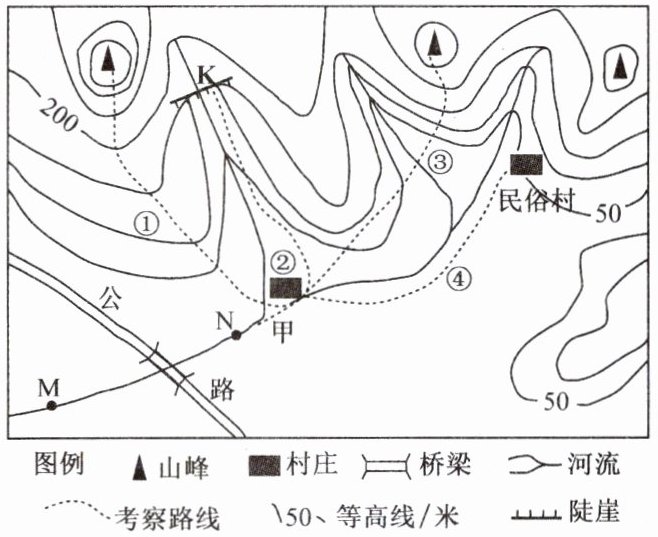 (地理实践力·野外考察)野外考察是学习地理的重要方式之一。某校地理社团的同学们利用周末时间去某民俗村及周边研学考察。读该民俗村及周边区域等高线地形图,完成 8~10 题。