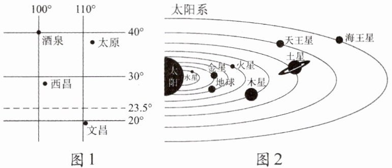 16.【聚焦航天助推强国】航天梦是强国梦的重要组成部分。探索浩瀚宇宙,发展航天事业,建设航天强国是我国航天人不懈追求的航天梦。随着中国航天事业快速发展,中国人探索太空的脚步会迈得更大、更远。图1为中国四大卫星发射基地位置图,图2为太阳系八大行星示意图。读图,回答下列问题。(5分)