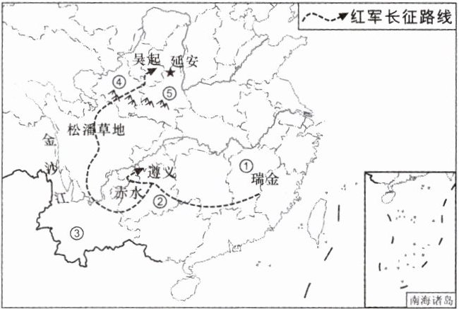 (1)沿着红军长征的足迹走,写出中央红军出发地①省区和终点地⑤省区的行政中心。
