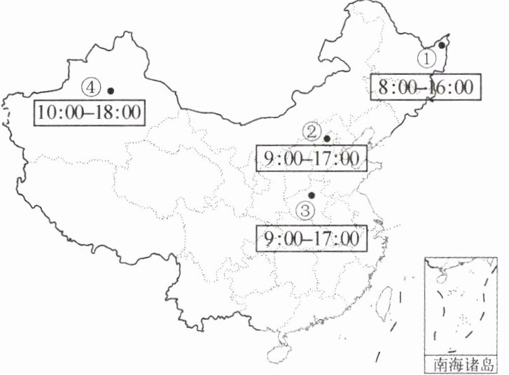 11. 图中①②③④四地邮局营业时间存在差异的主要原因是(
