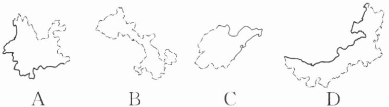 13. (跨学科·语文)“波光潋滟三千顷,莽莽群山抱古城。四季看花花不老,一江春月是昆明。”当古诗词遇见中国地理,是一场传统文化与山川湖海的盛宴。关于诗词中描述的省区轮廓图,下列四幅图中与之相符合的是(