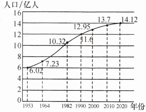 (综合思维)(宜昌中考)自中华人民共和国成立以来,我国开展了七次全国人口普查。读中国历次人口普查结果变化图,完成1~2题。