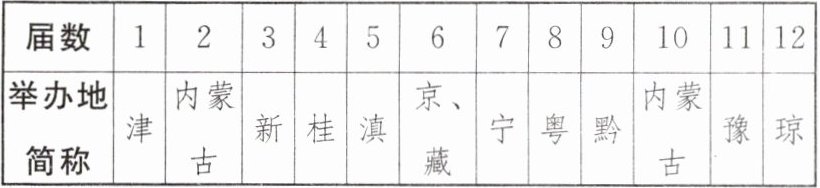 第十二届全国少数民族传统体育运动会于2024年11月在海南省三亚市举办,本届运动会以“团结奋斗、扬帆征程”为主题,共设18个竞赛项目和3大类表演项目。读下表(历届全国少数民族传统体育运动会举办地所在省级行政区域简称),完成8~10题。