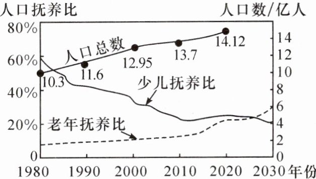 人口抚养比是指非劳动年龄人口数与劳动年龄(15岁~64岁)人口数之比。读1980—2030年我国人口总数、人口抚养比变化趋势图(下图),完成10~12题。