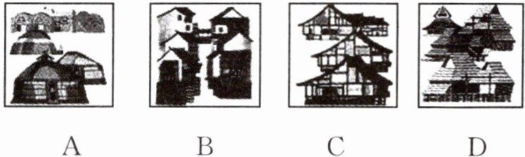 3. 下面是一组我国民居的邮票背景,从房屋造型来看,降水量最少的是(