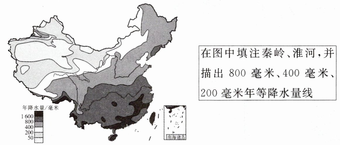 在图中填注秦岭、淮河,并描出 800 毫米、400 毫米、200 毫米年等降水量线