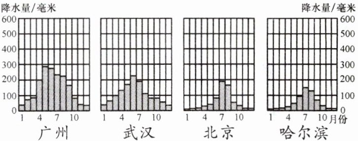 读我国南北四个城市降水量的季节差异图,完成 1~2 题。