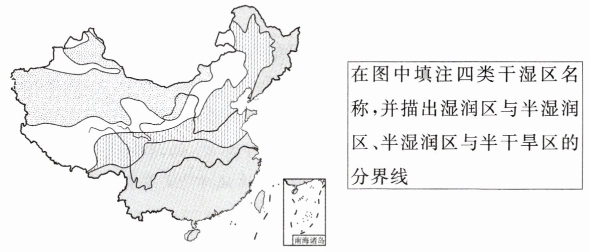 在图中填注四类干湿区名称,并描出湿润区与半湿润区、半湿润区与半干旱区的分界线
