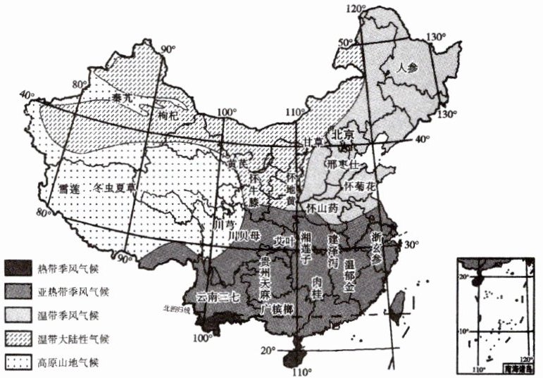 (中华优秀传统文化)本草,是中药的统称,最初中国人把用来治病的植物称为本草。读我国部分本草分布图,完成 1~2 题。