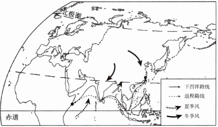 明朝郑和七次出使西洋,最远到达非洲东海岸,传播了中华文明,促进了沿途地区与明朝的社会经济交往。下图示意郑和下西洋路线与亚洲的冬夏季风风向。据此完成7~8题。